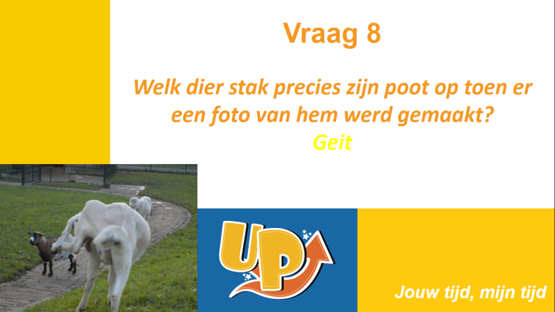 Hierna kwam de krantjesquiz, waar we zo naar uit hadden gekeken. Iedereen had een geel en blauw briefje. Er kwam een vraag in beeld en dan moest je de juiste kleur briefje in de lucht steken. Daarna keken we welk antwoord goed was. Het was duidelijk dat de meeste mensen de krantjes goed hadden gelezen. We hebben er veel lol mee gehad!