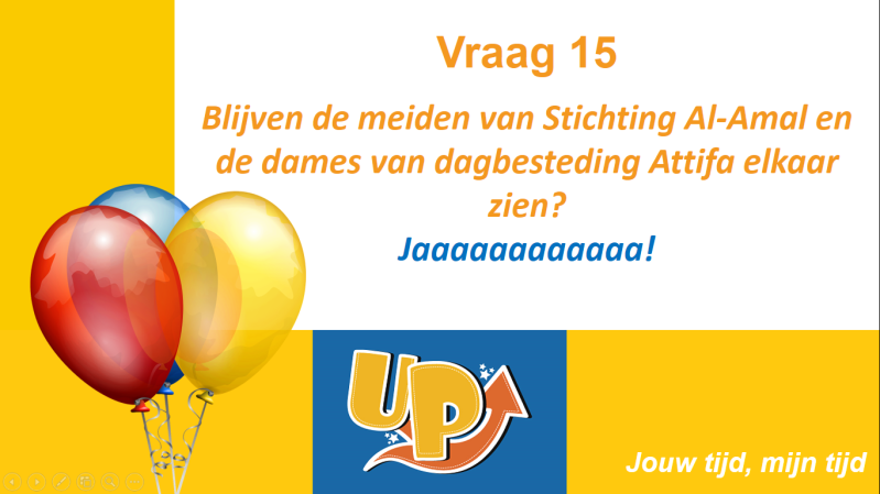 Het UP-project is afgelopen. De meiden van Stichting Al-Amal en de oudere dames van dagbesteding Attifa blijven elkaar wél zien. Het is zo goed bevallen om met elkaar activiteiten te ondernemen dat ze hiermee door blijven gaan.
