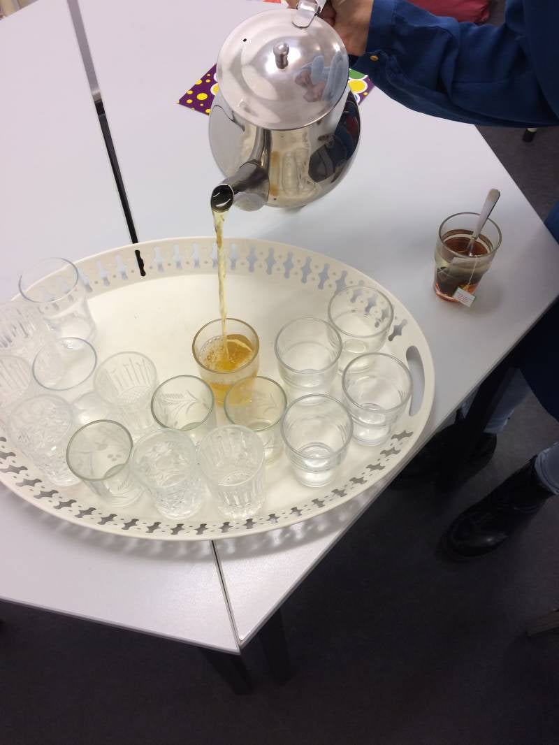 Tussendoor werd iedereen verwend met een gebakje. De keuze was tussen appelkruimel of rijstevlaai. Nou, dat ging erin als koek! Of… moet ik zeggen: gebak. ;) Bij de taart werd er Marokkaanse thee geschonken op de originele manier.